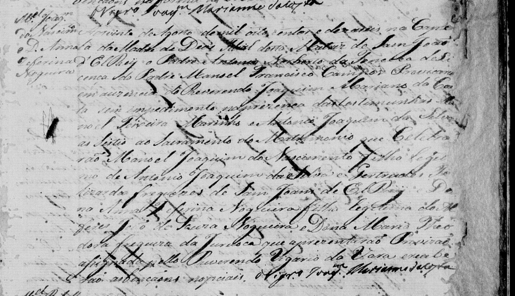 ANA married Cap. MANOEL JOAQUIM DO NASCIMENTO [image] son of ANTÔNIO JOAQUIM DA SILVA (ou da Silva Borges) and GERTRUDES FELIZARDA DO NASCIMENTO (ou Gertrudes Maria Felizarda) on 20 Aug 1816 in Madre de Deus de Minas, São João del Rei (MG). MANOEL was born calculated 1794 in Aiuruoca (MG).